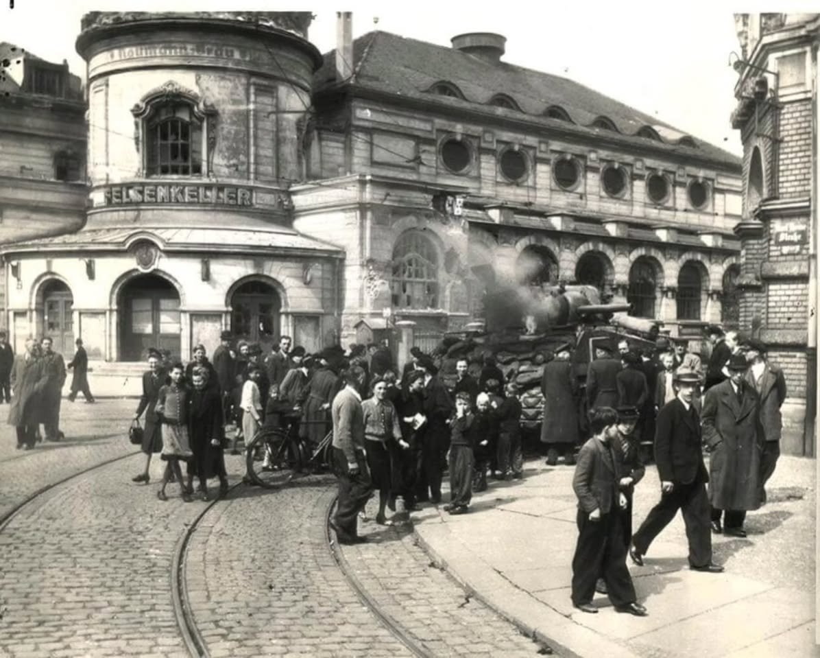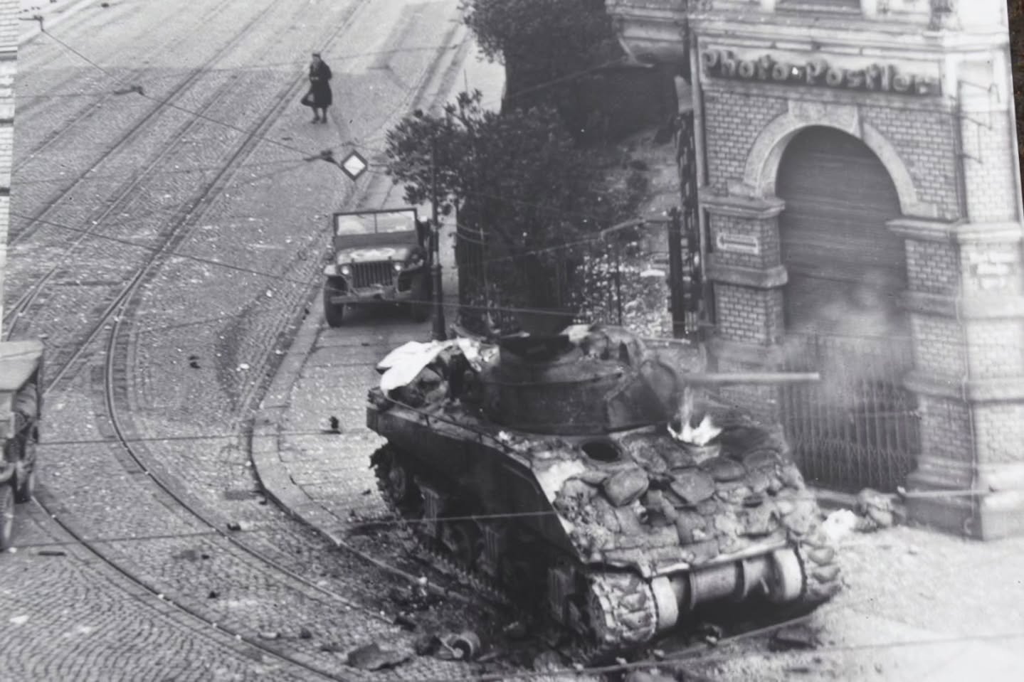 For instance, at 10am on the 18th, a column of American tanks was passing by the Felsenkeller brewery on their way to the Klinger Bridge, when the lead Sherman tank from the 741st Tank Battalion was suddenly hit by a Panzerfaust rocket fired by a Hitler Youth boy hiding nearby.